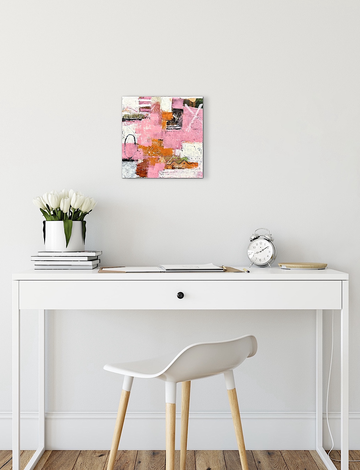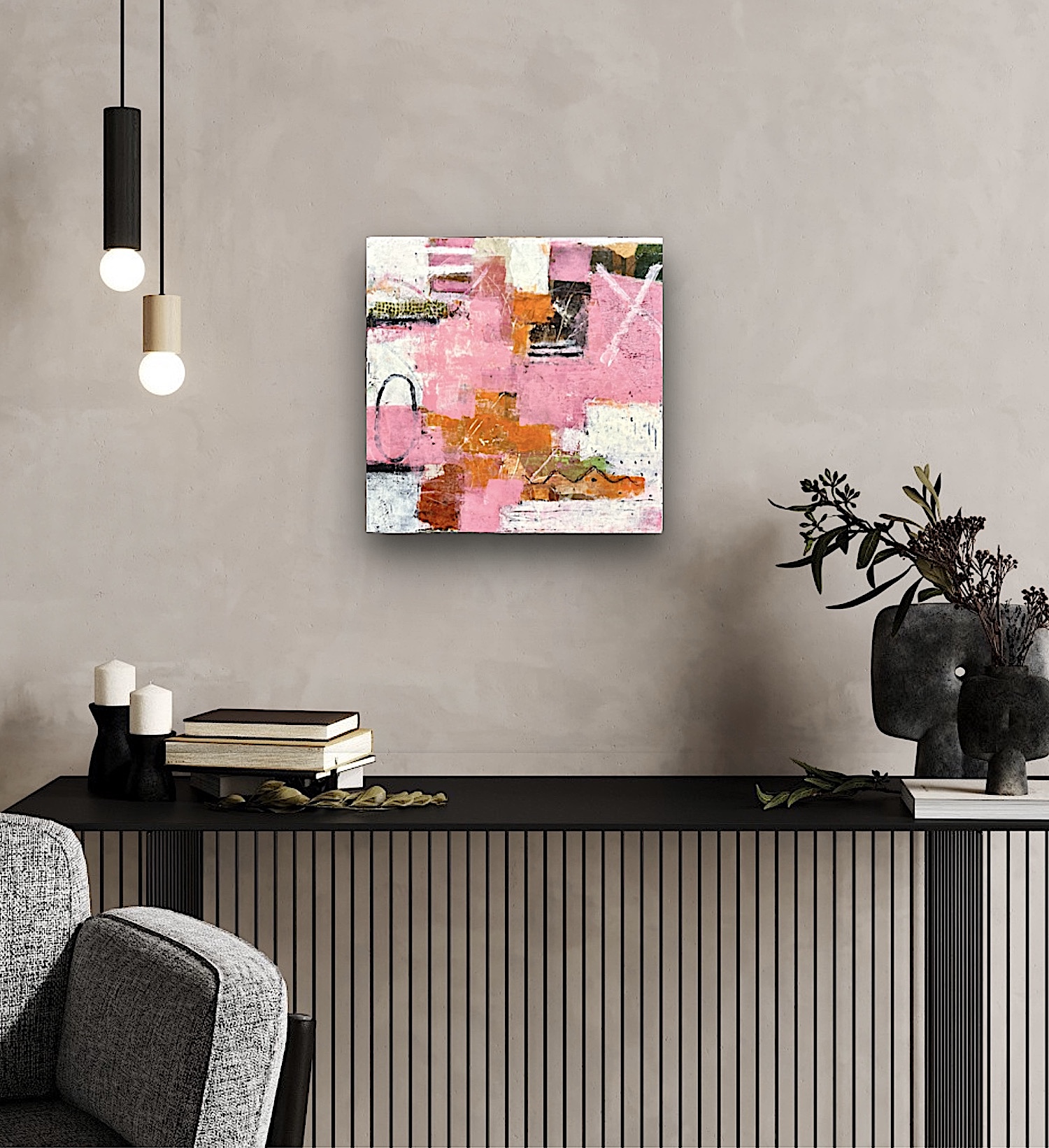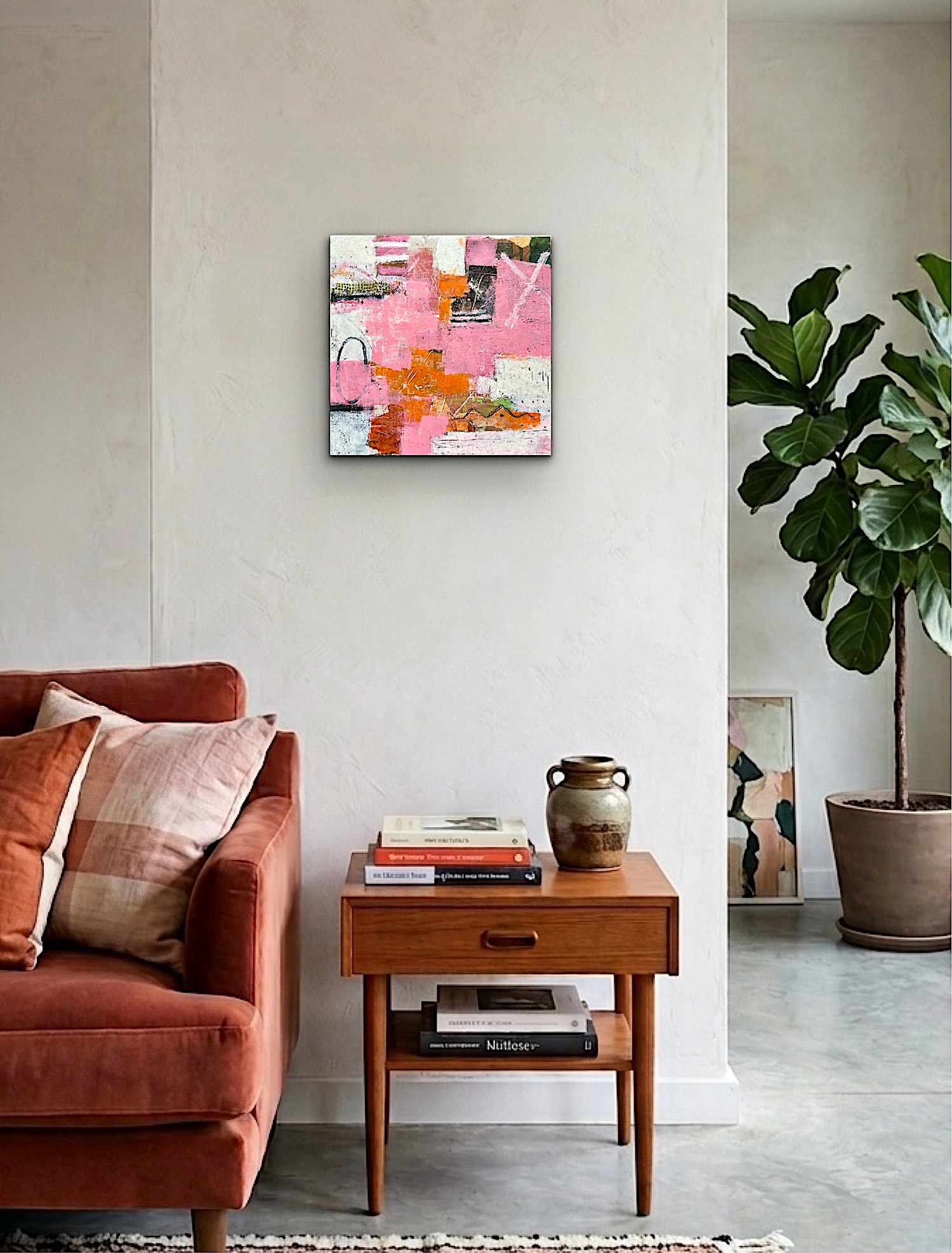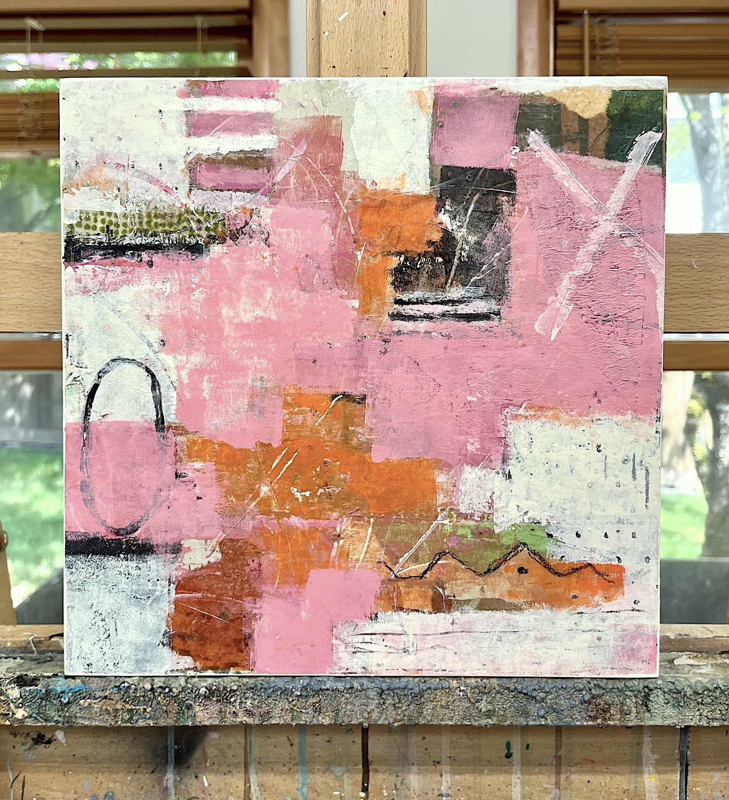 A vibrant exploration of texture and layered color, centered on a palette of rose pink and earthy orange. The composition uses a combination of collage, gestural mark-making, and impasto to create a sense of texture and depth.