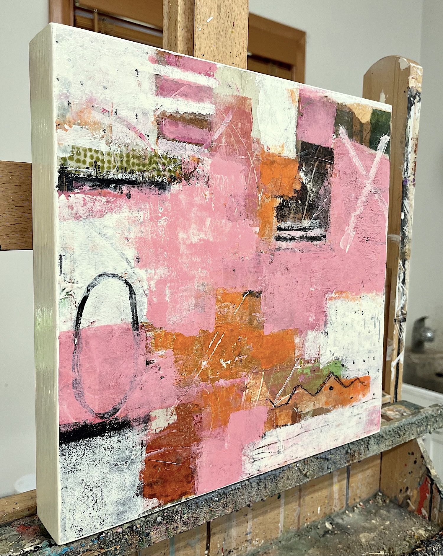 Mixed media acrylic and collage on cradled wood panel 12 x 12 x 1.5 inches.