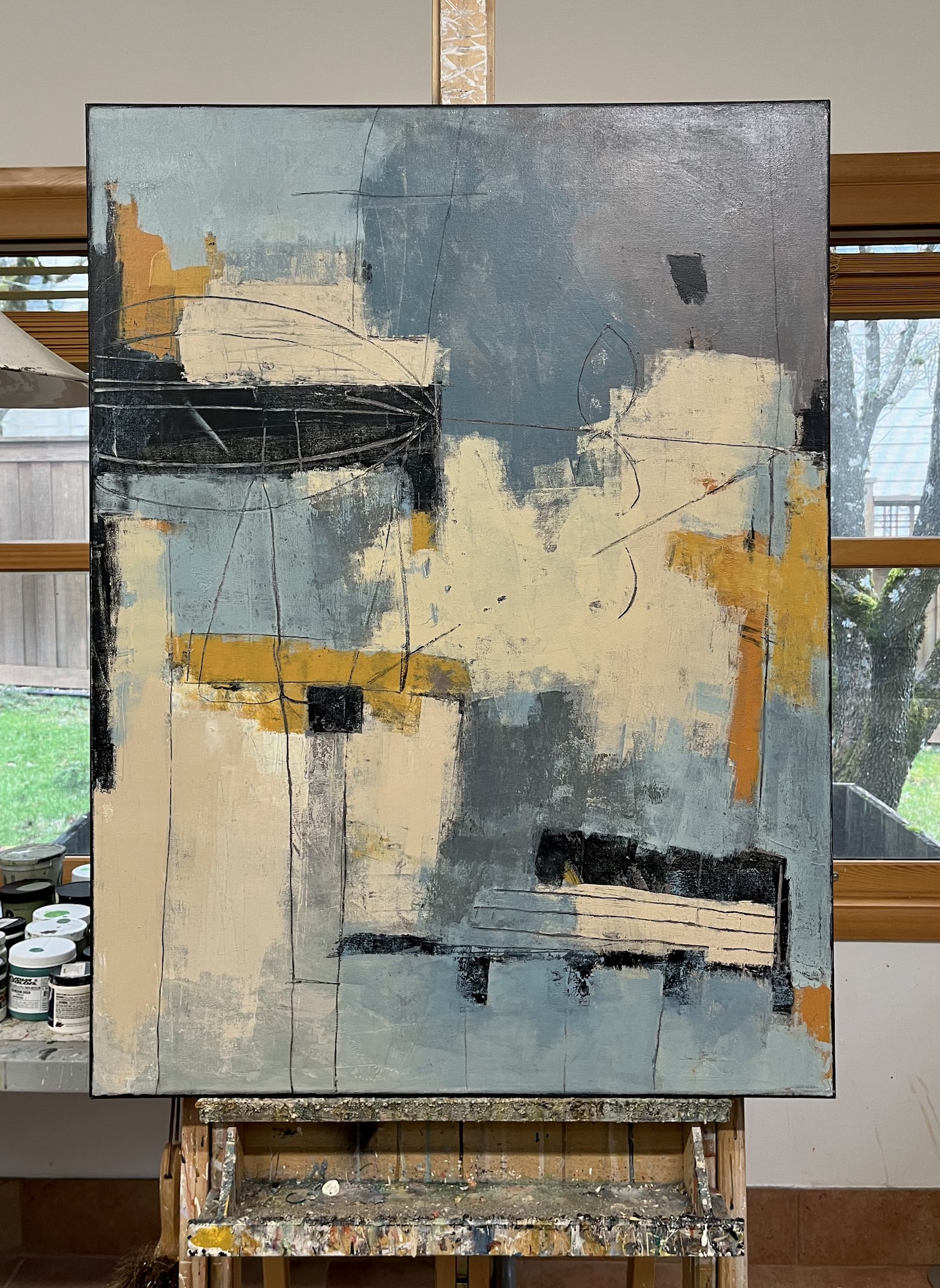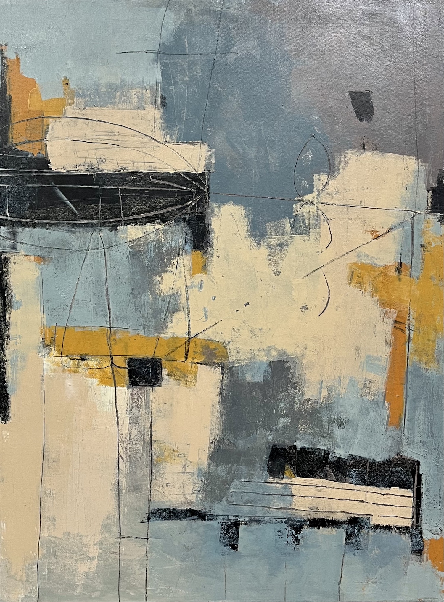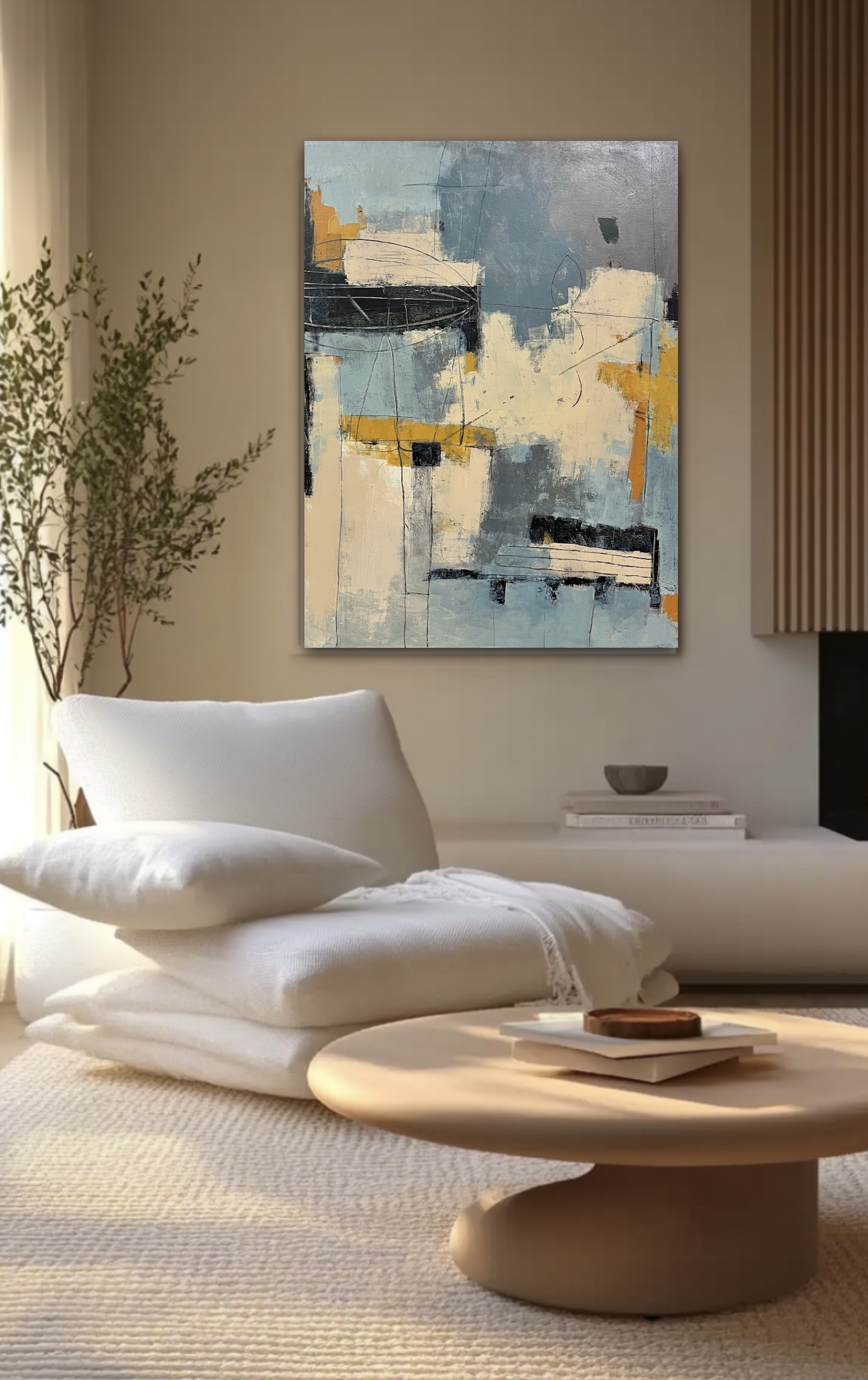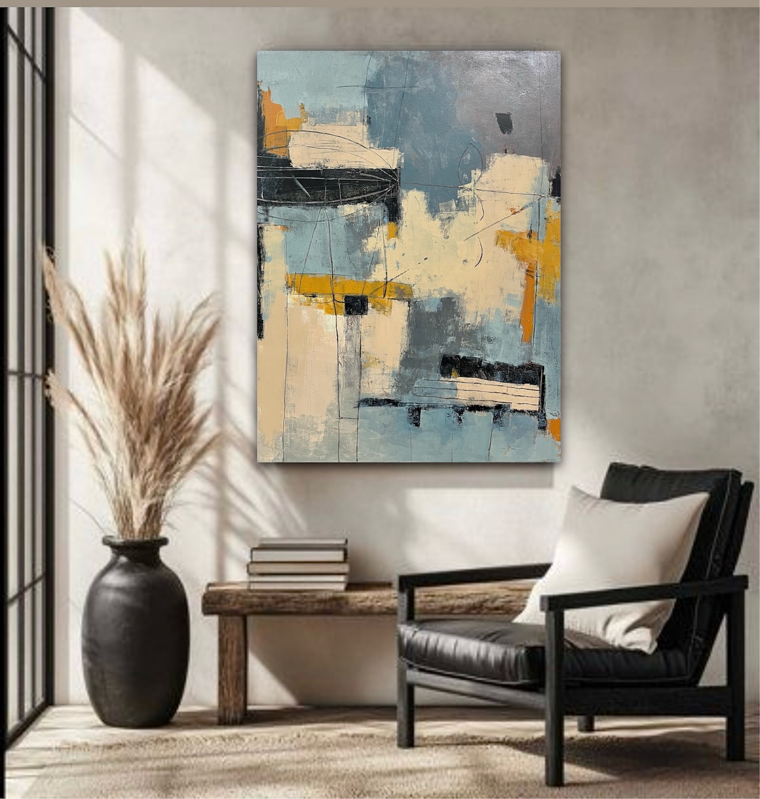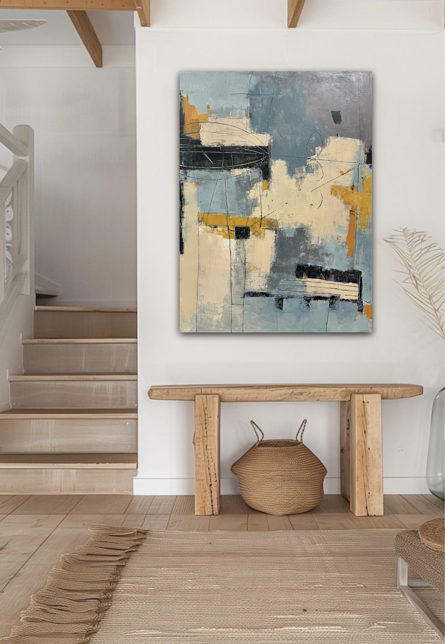 Layered fields of blue-gray, cream, and warm ochre are anchored by darker horizontal forms that suggest weight, pause, and resistance. The composition feels controlled but not rigid, allowing structure and openness to coexist within a dynamic architectural space.