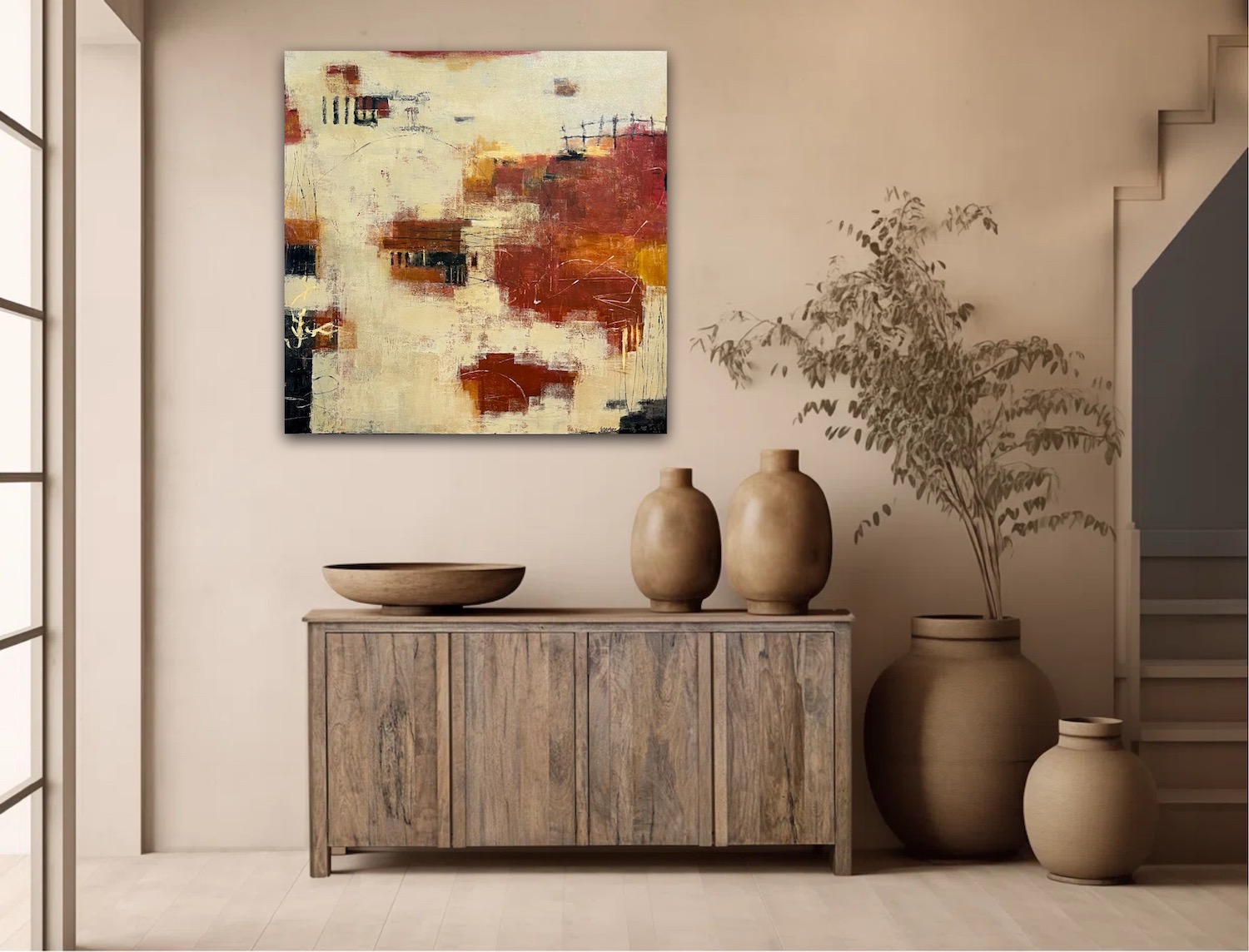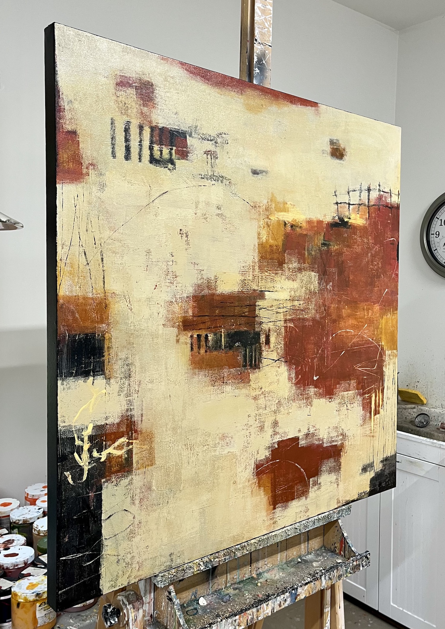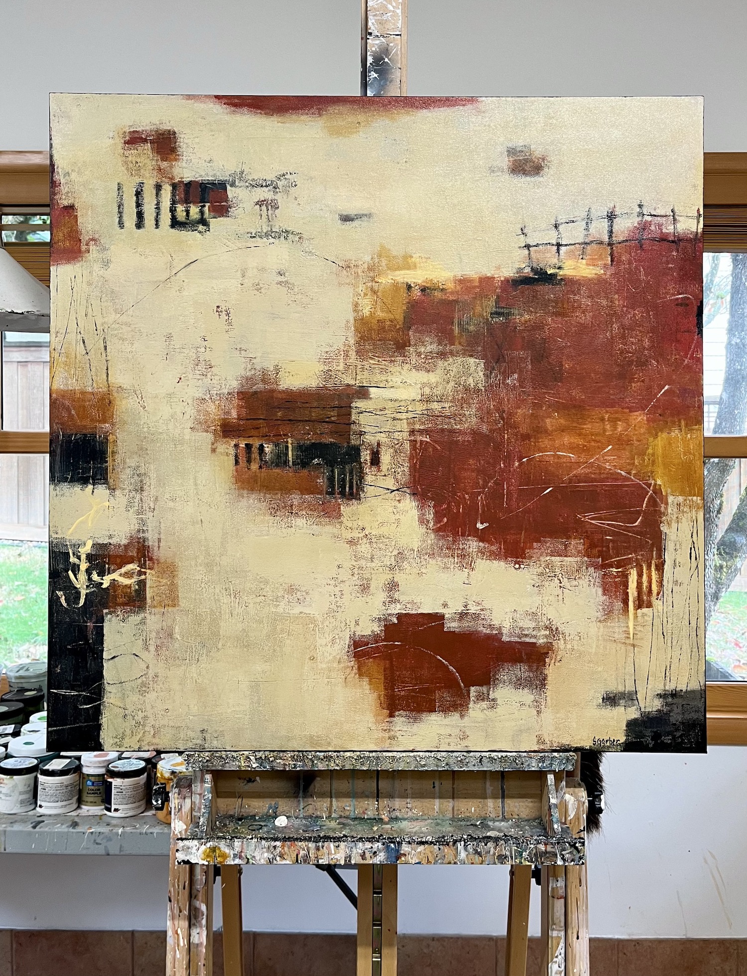 Abstract acrylic painting on gallery wrapped canvas 36 x 36 x 1.5 inches.
