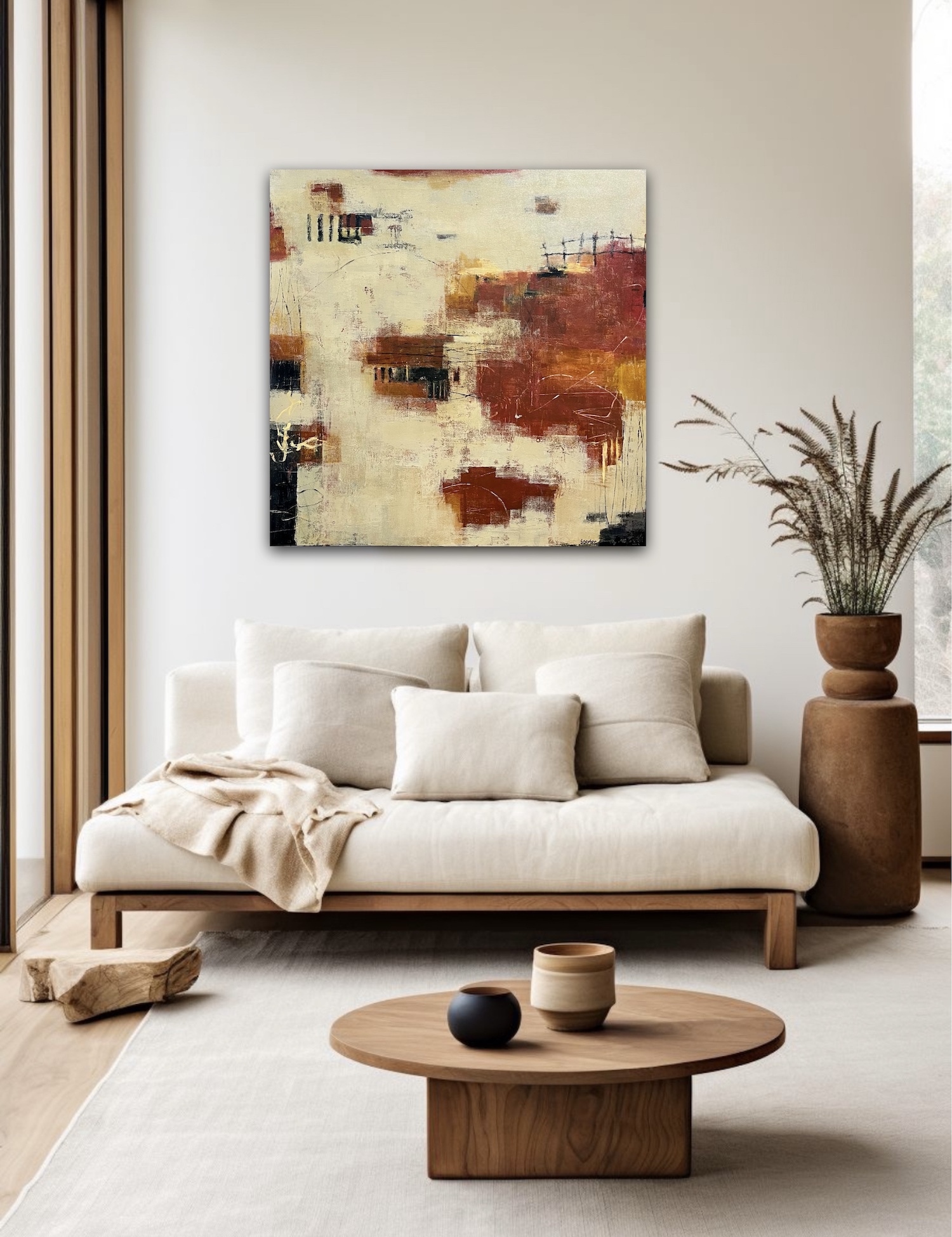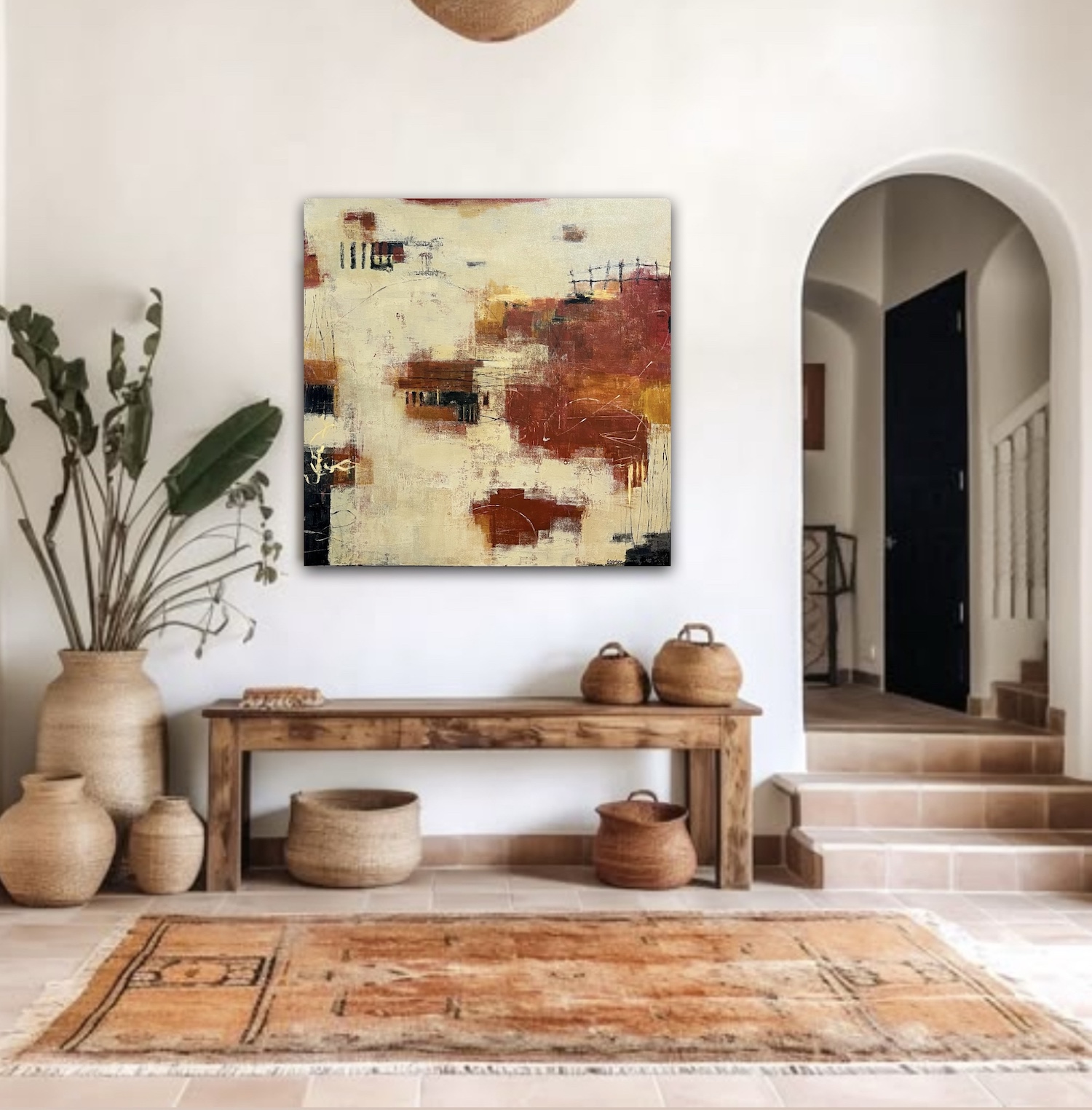 Warm, earthy tones and textured layers in a rustic landscape composition.