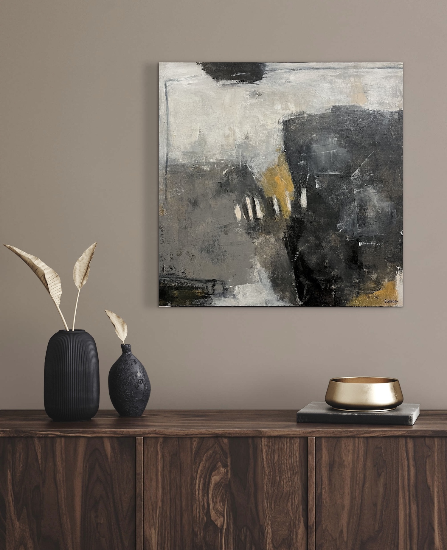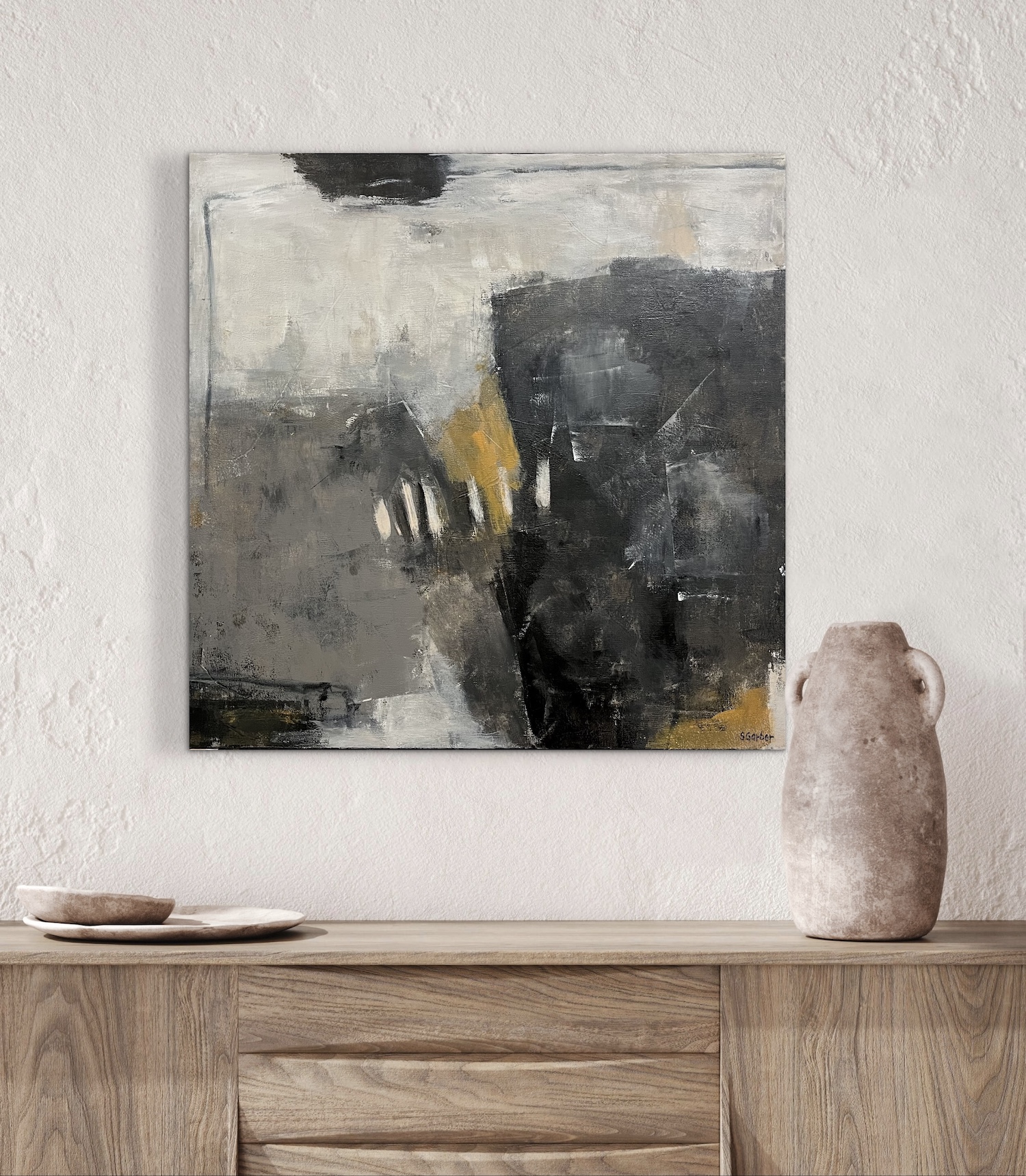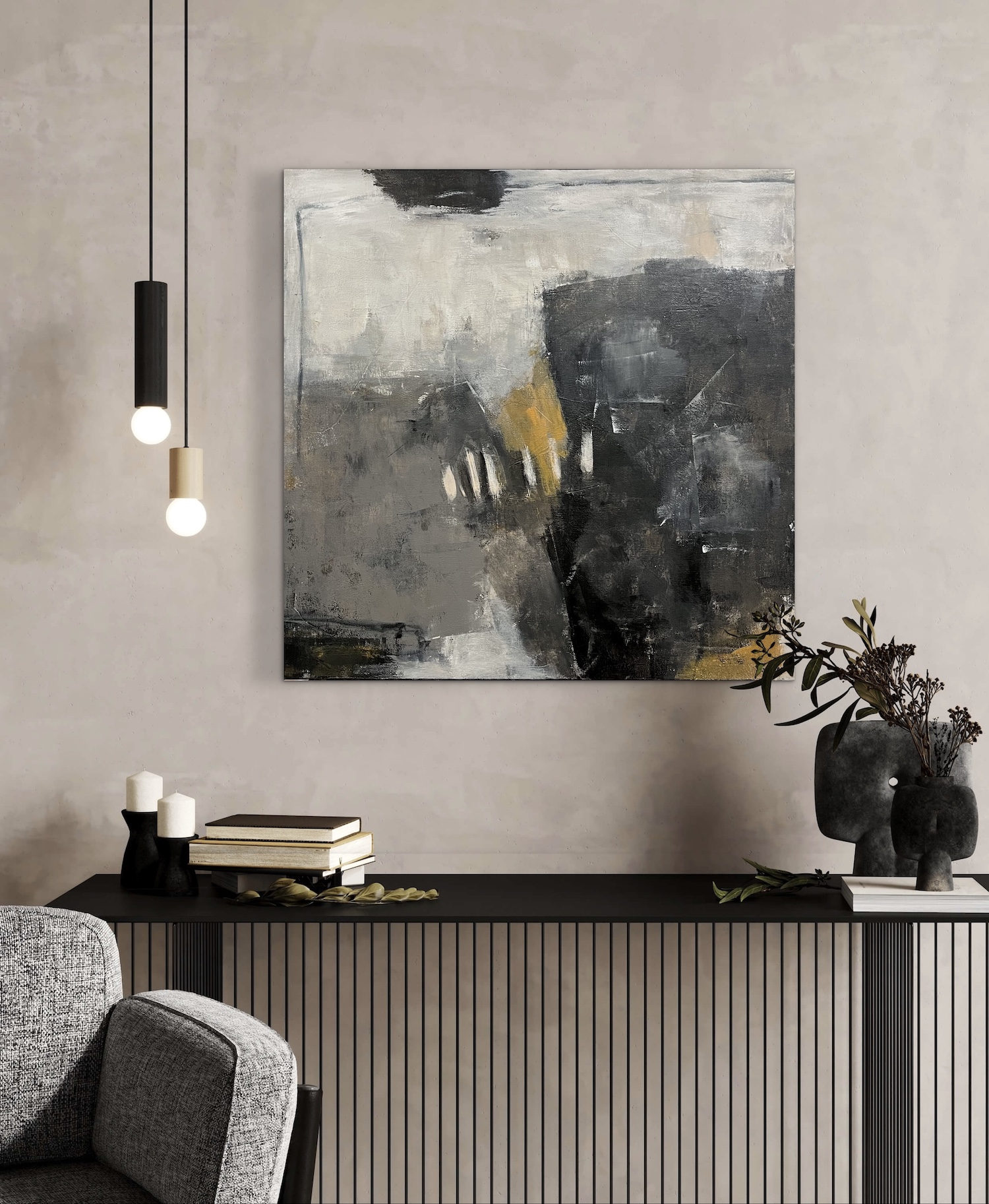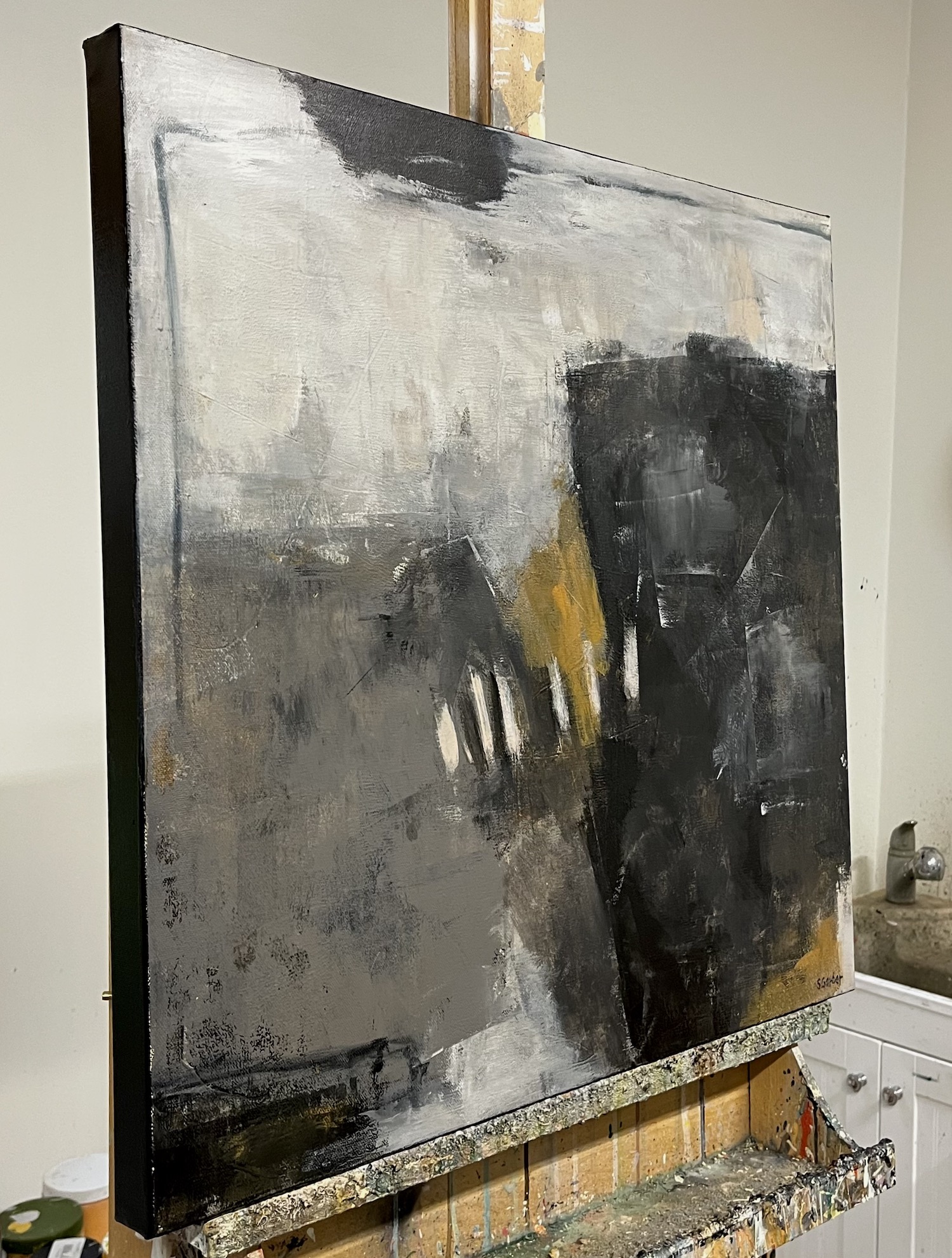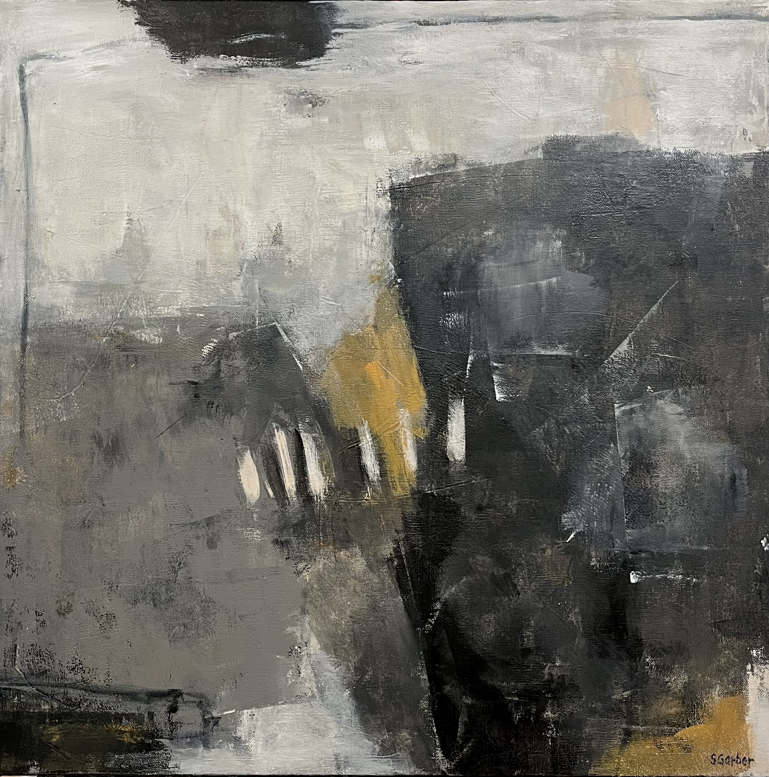 A dark field interrupted by textured whites, grays, and muted ochre light.