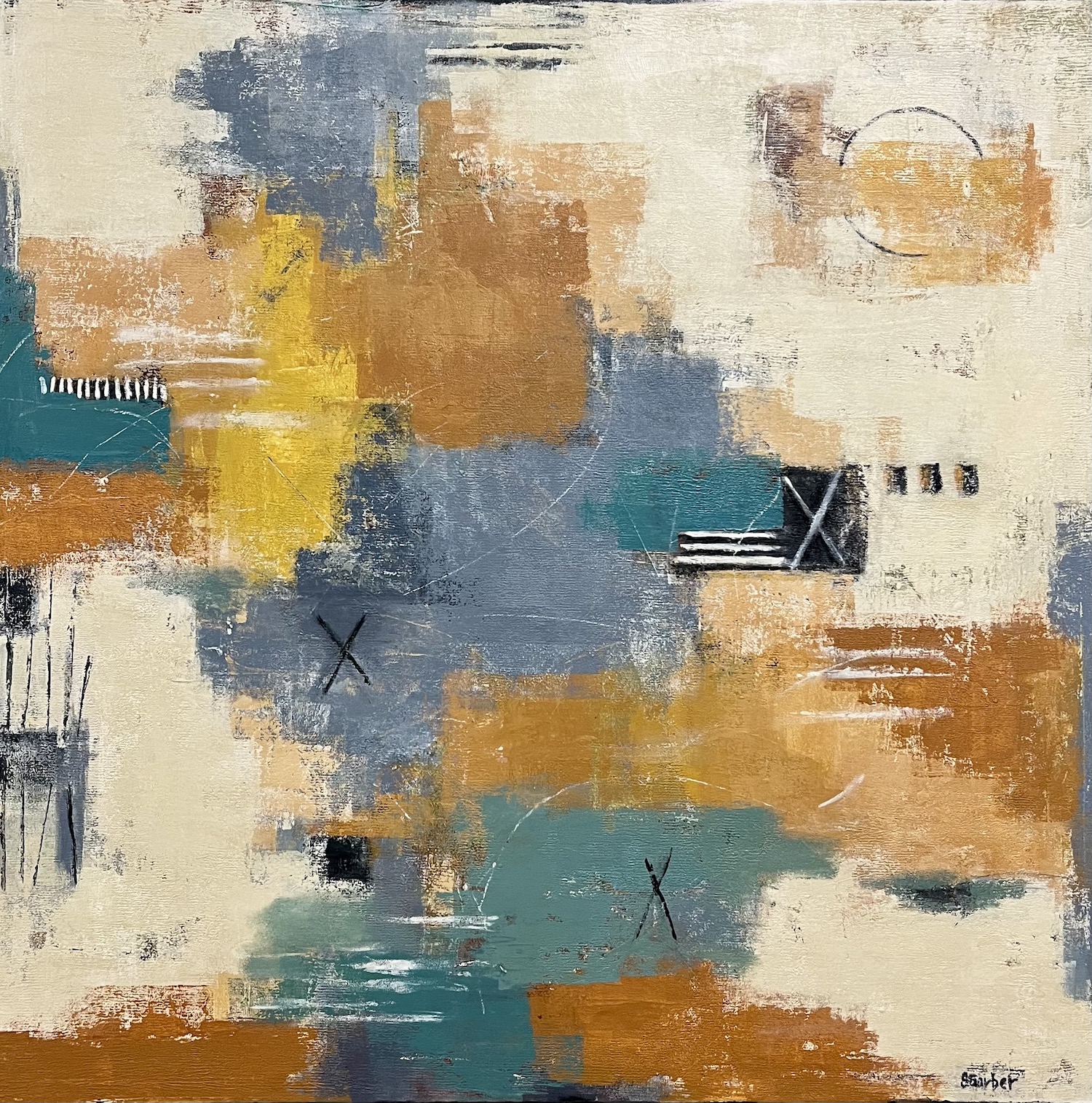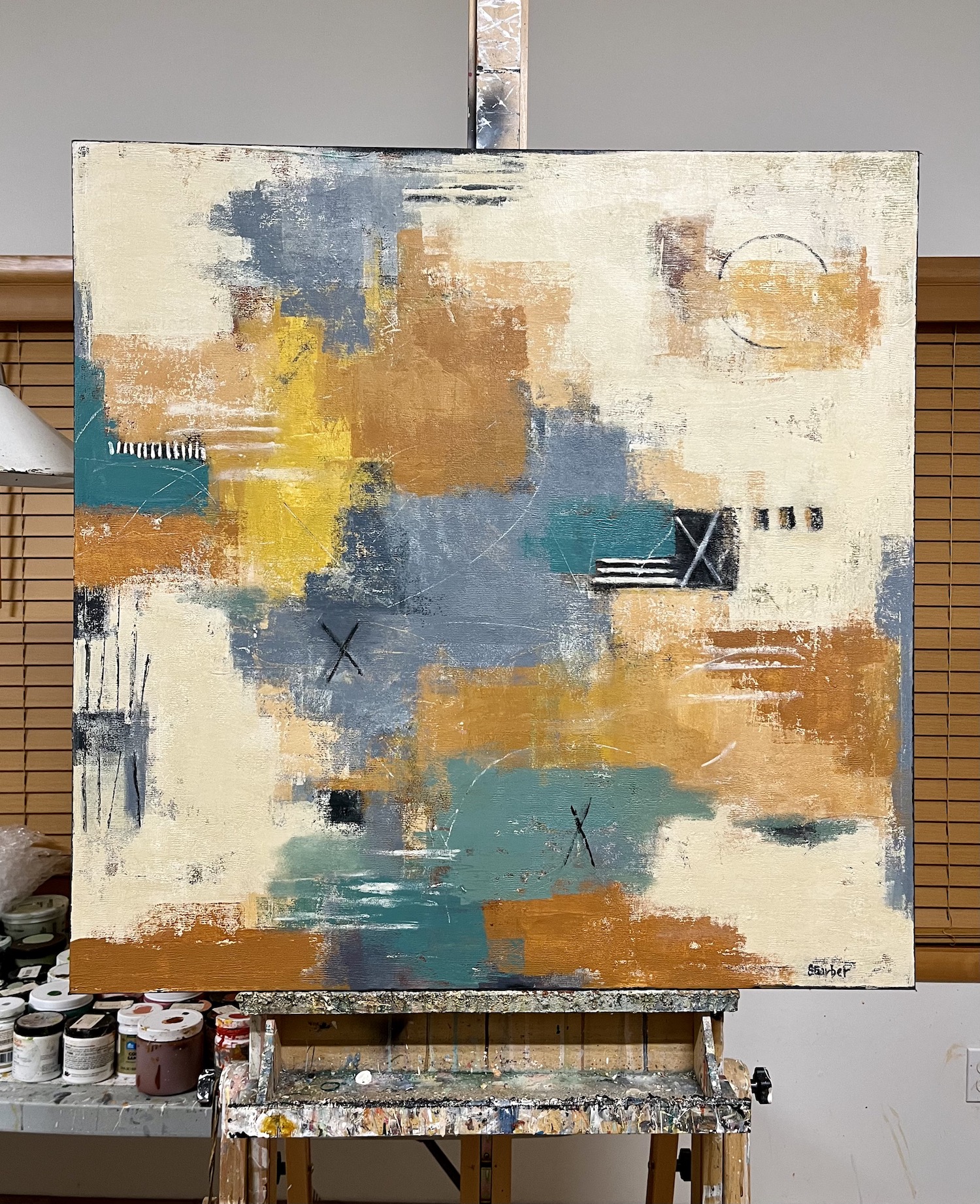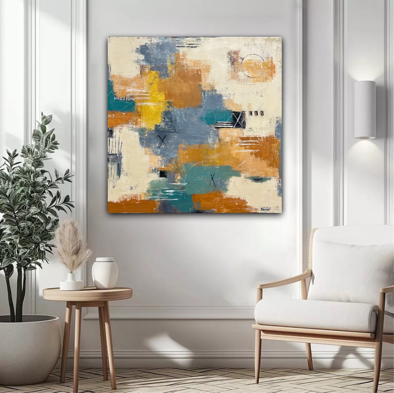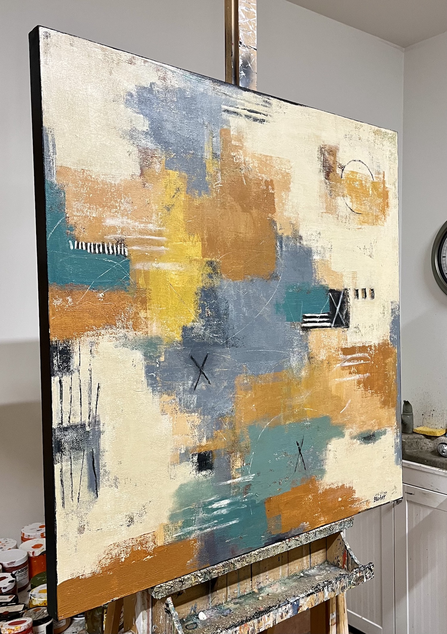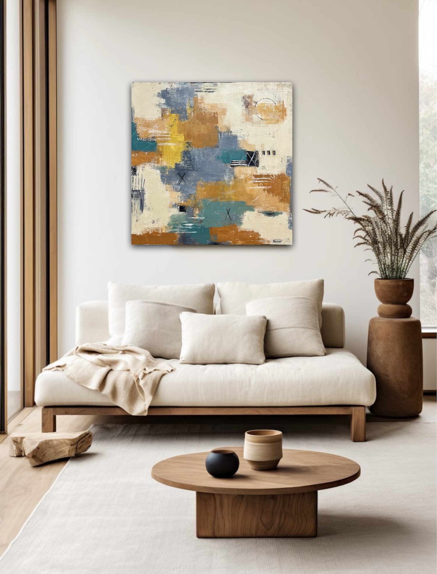 Layers of ochre, slate blue, teal, and buff create a soft field of movement. Light marks and simple shapes add structure, giving the piece a calm, weathered presence.