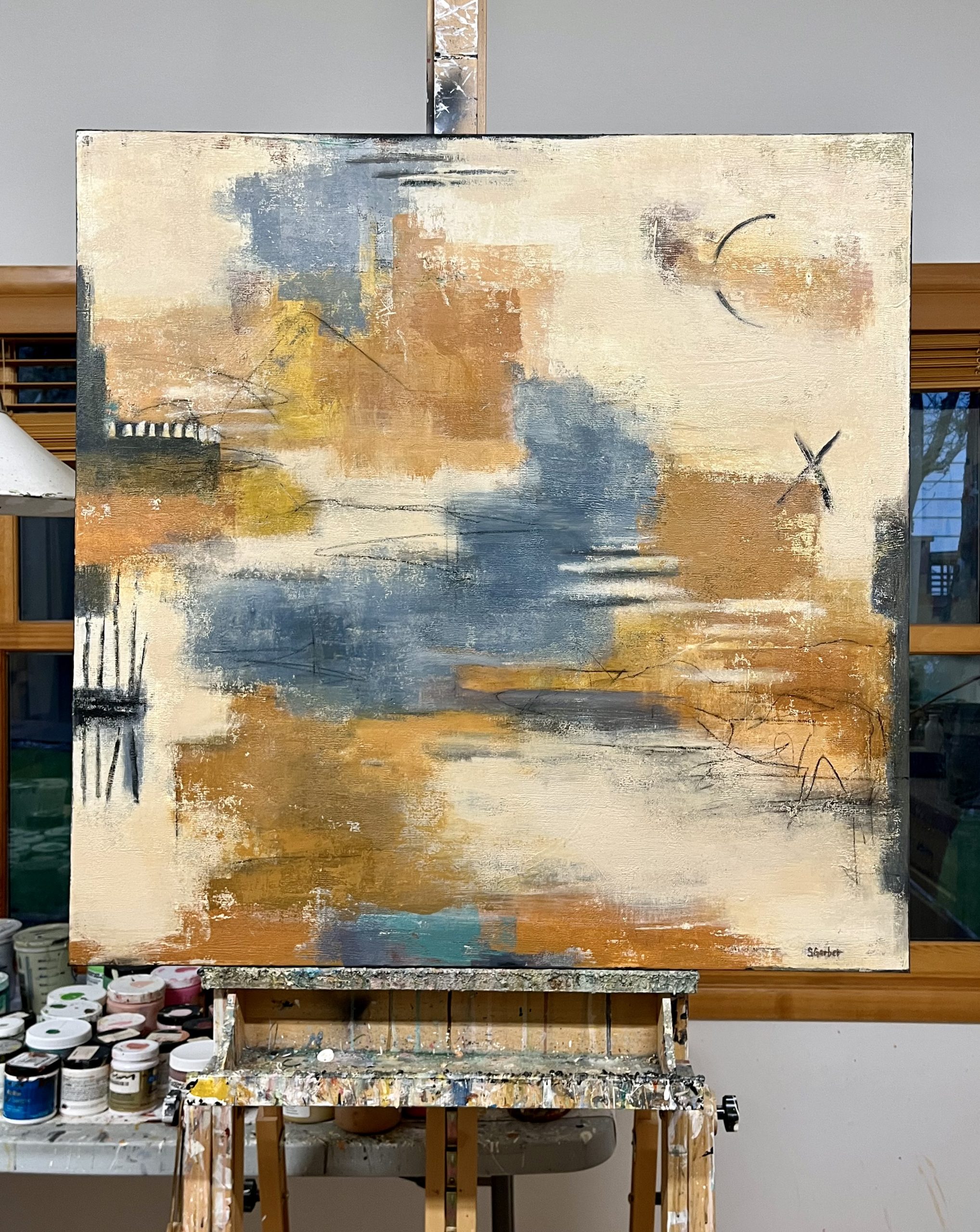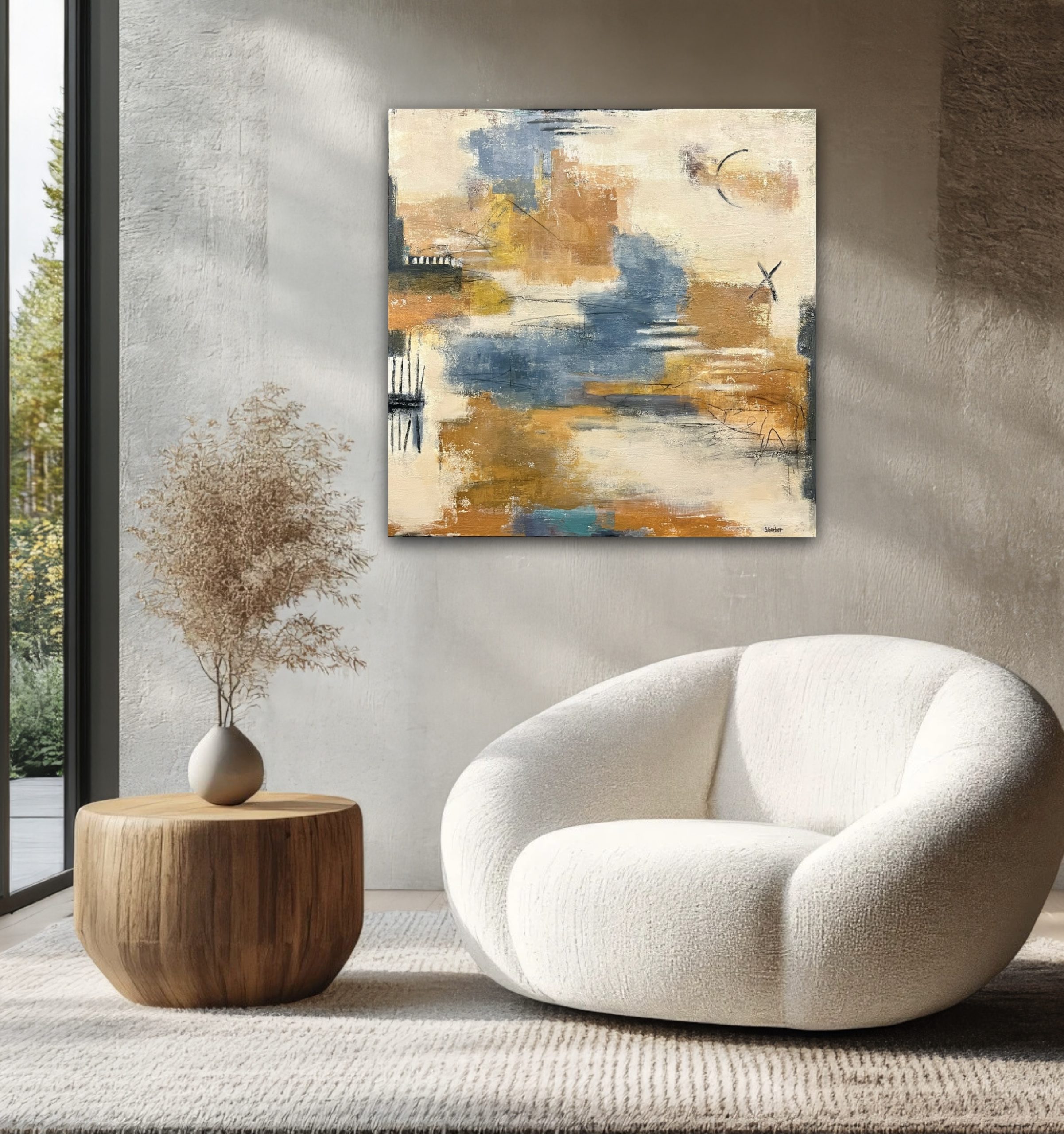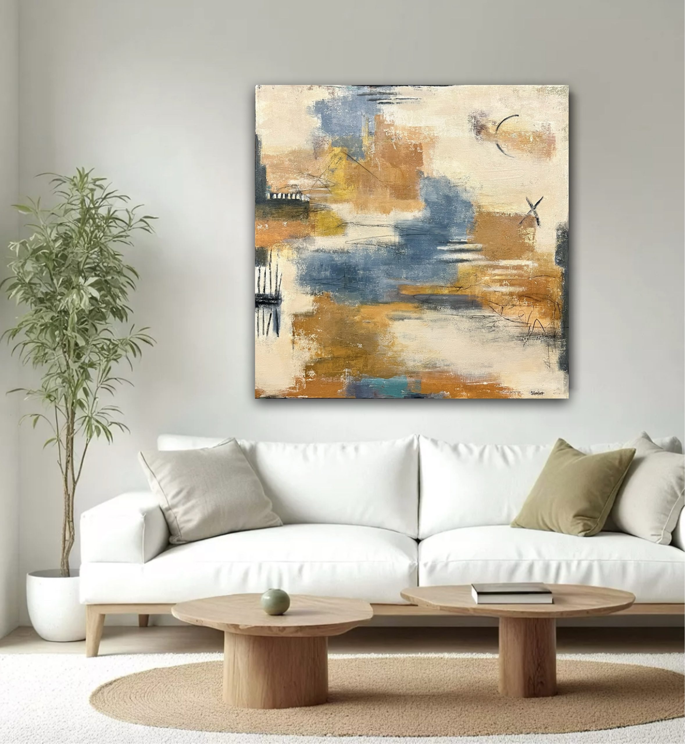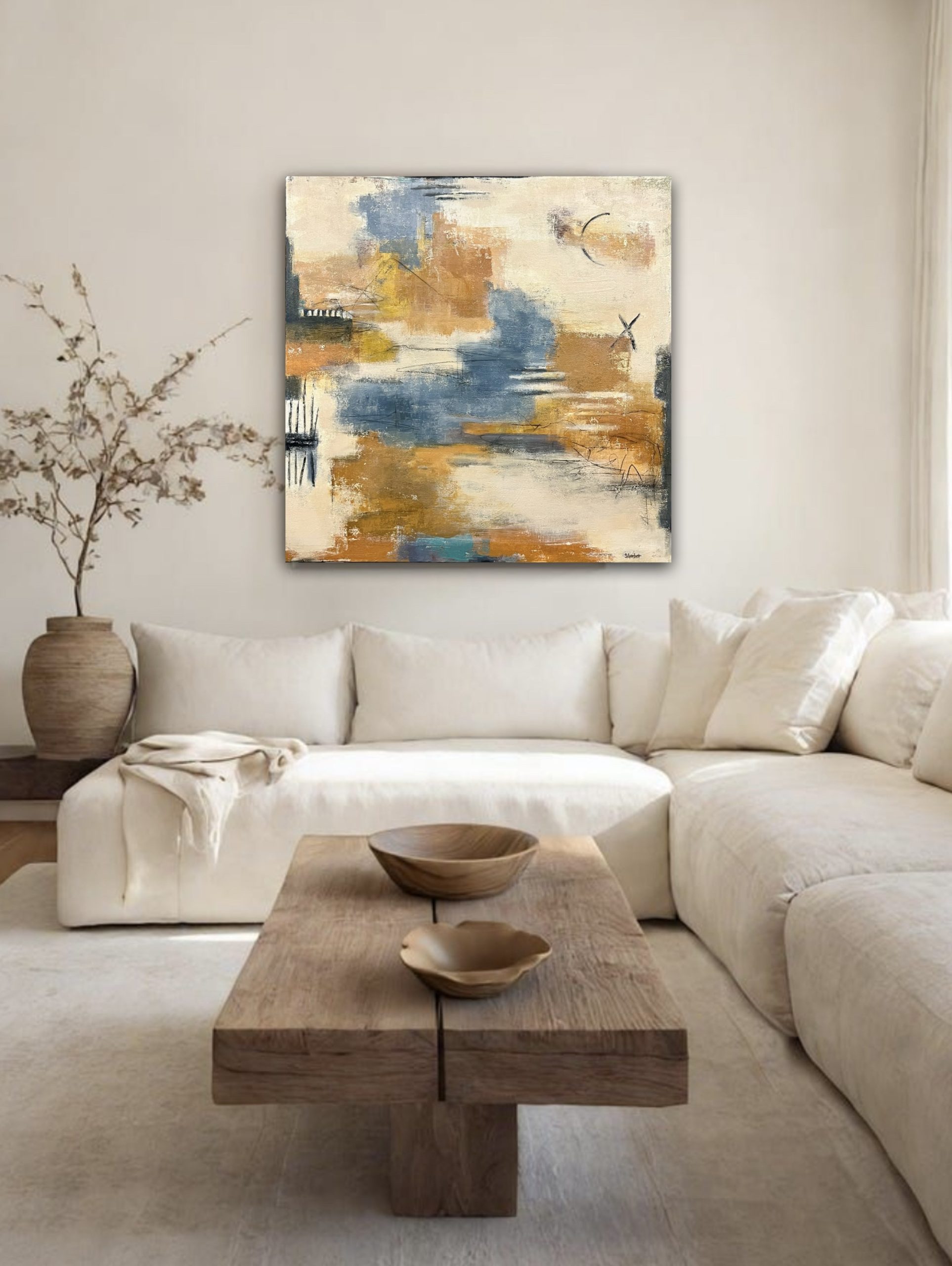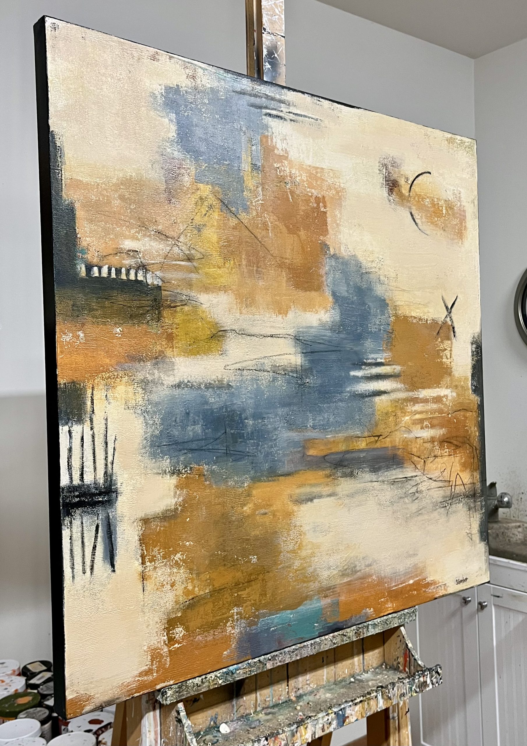 High Mesa balances structured ochre tones with fluid sweeps of cool blue and charcoal.