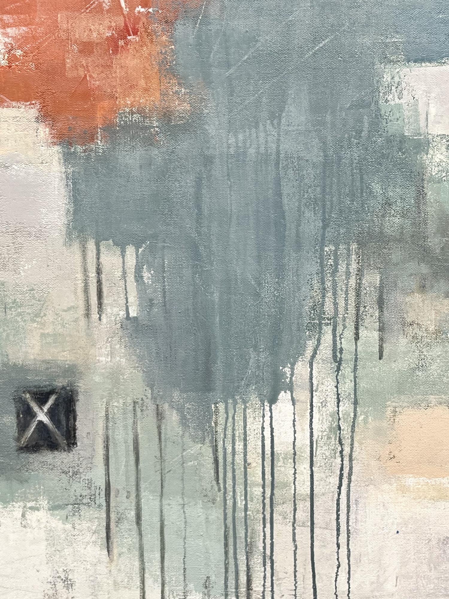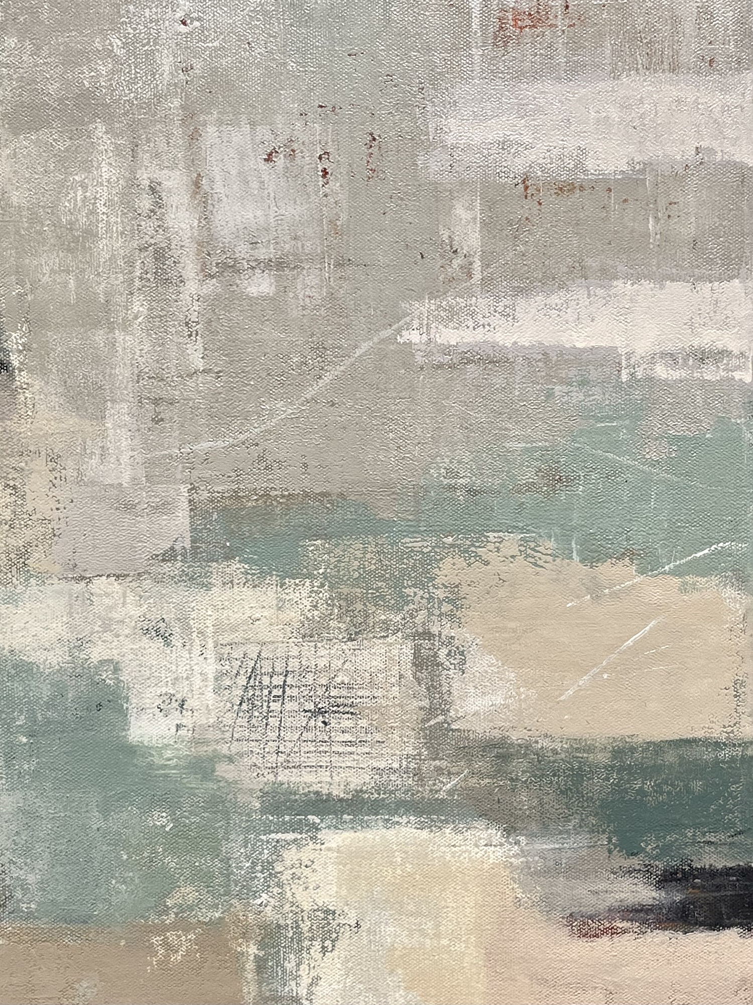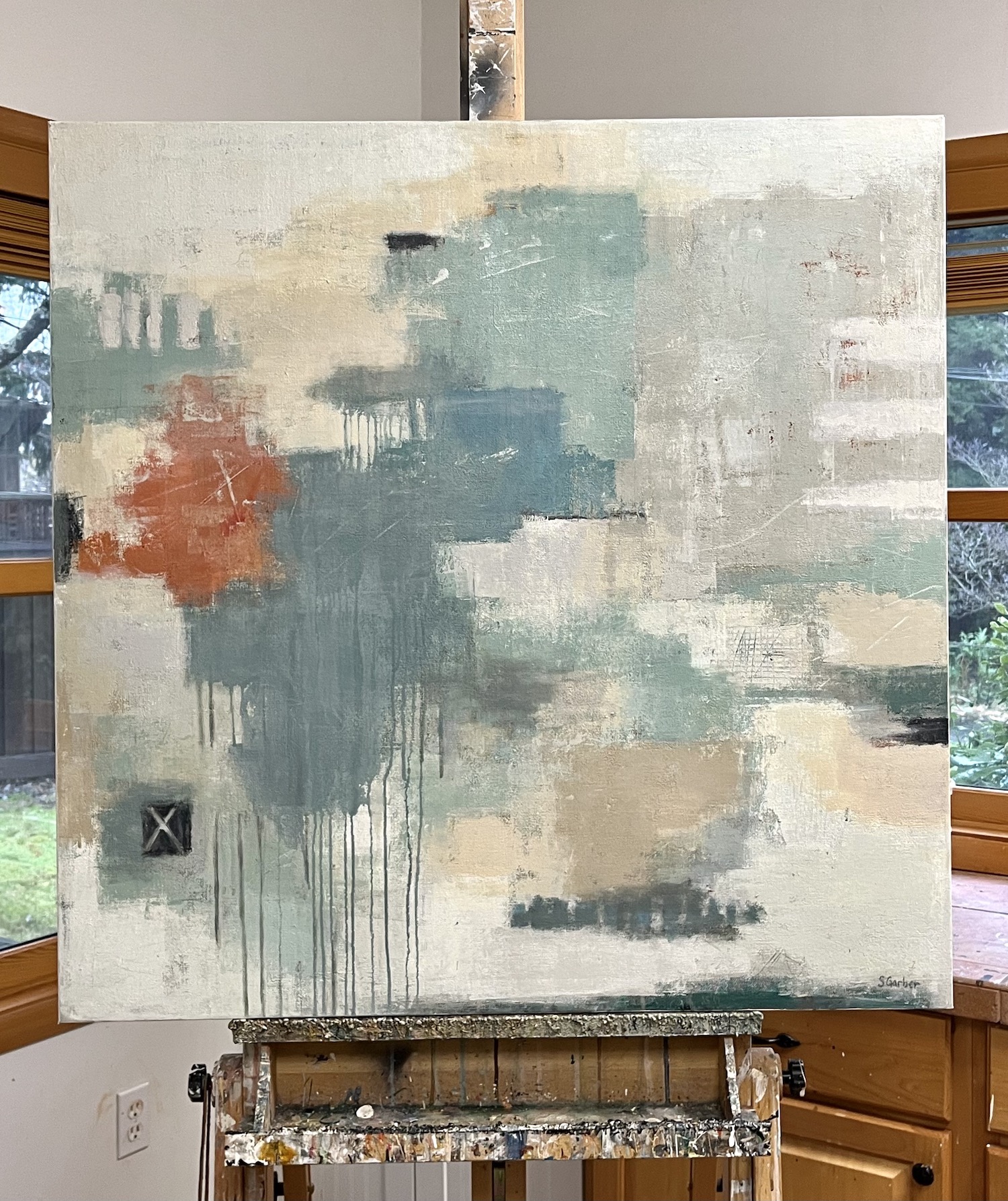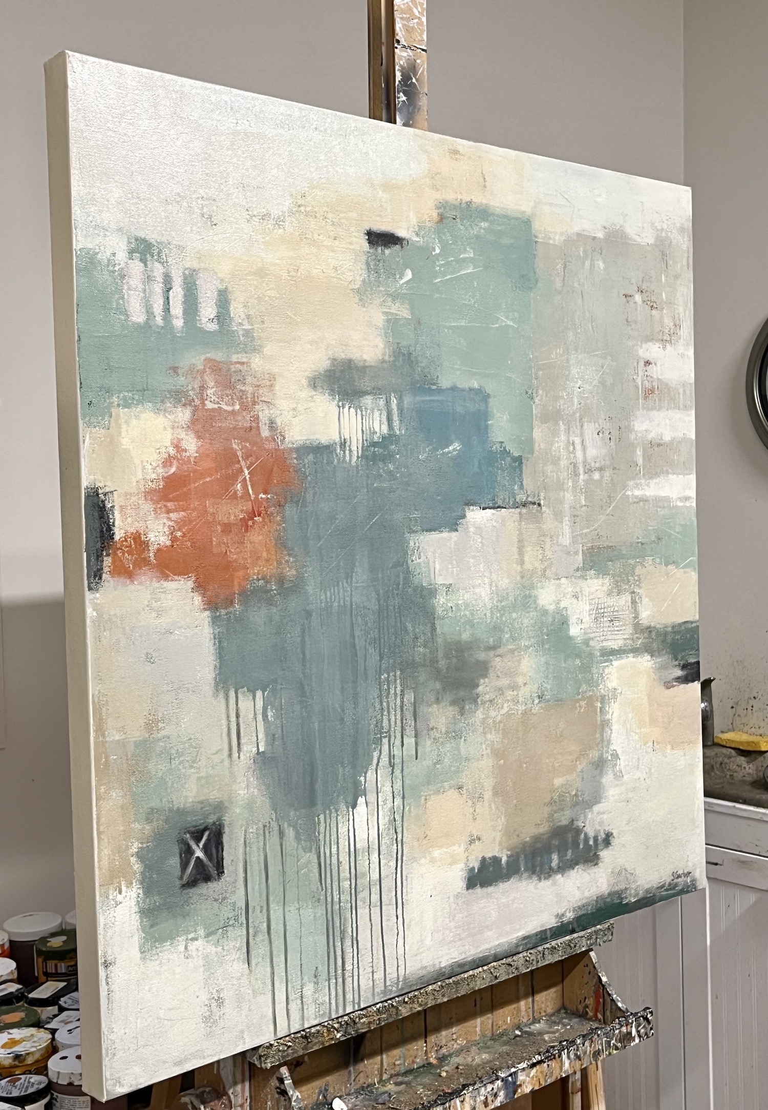 Acrylic on gallery-wrapped canvas, 36 x 36 × 1.5 inches. Soft coastal blues and warm neutrals create a calm field of shifting color and texture.