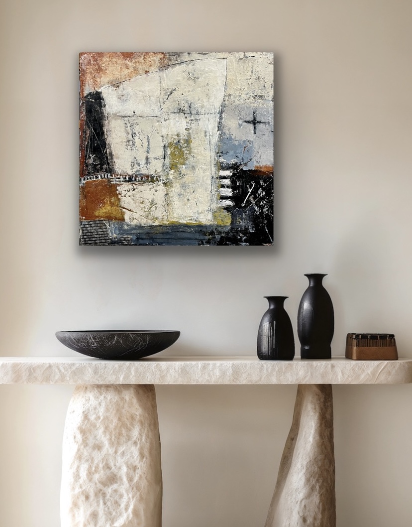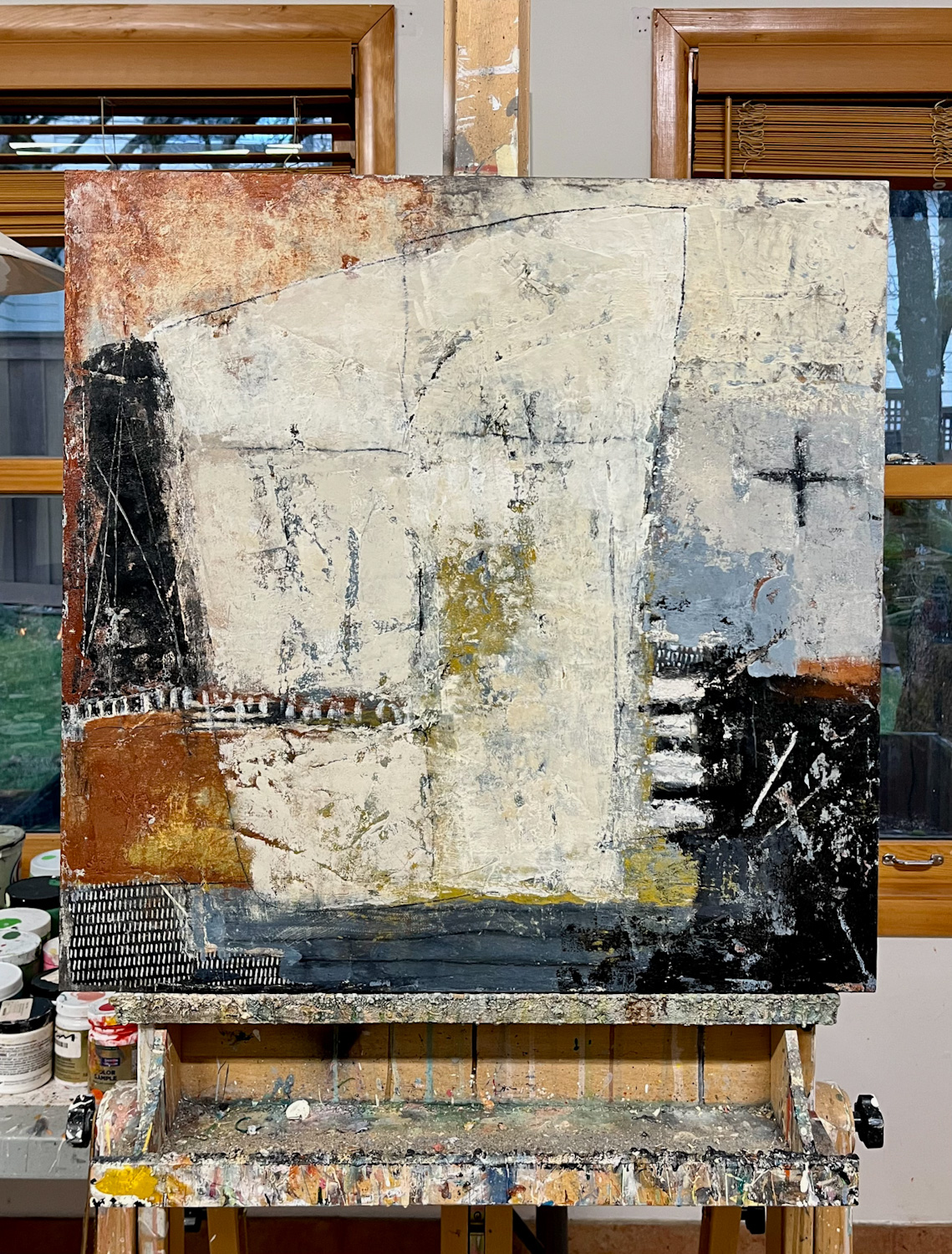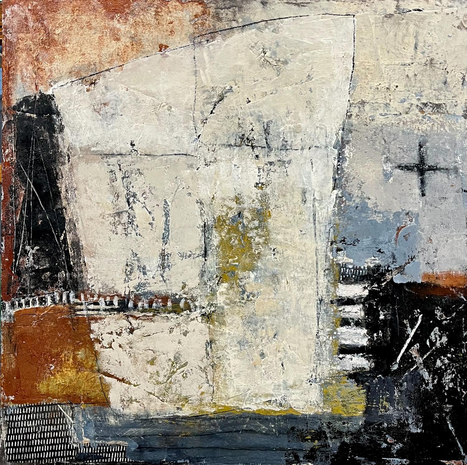 Mixed media acrylic and collage on cradled wood panel 24 x 24 x 1.5 inches.