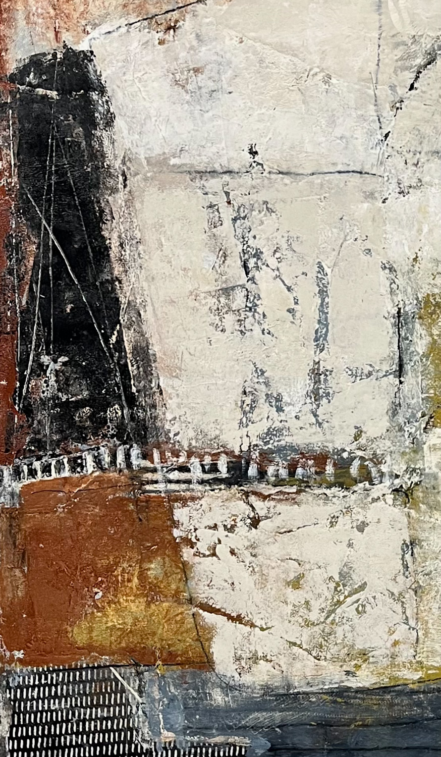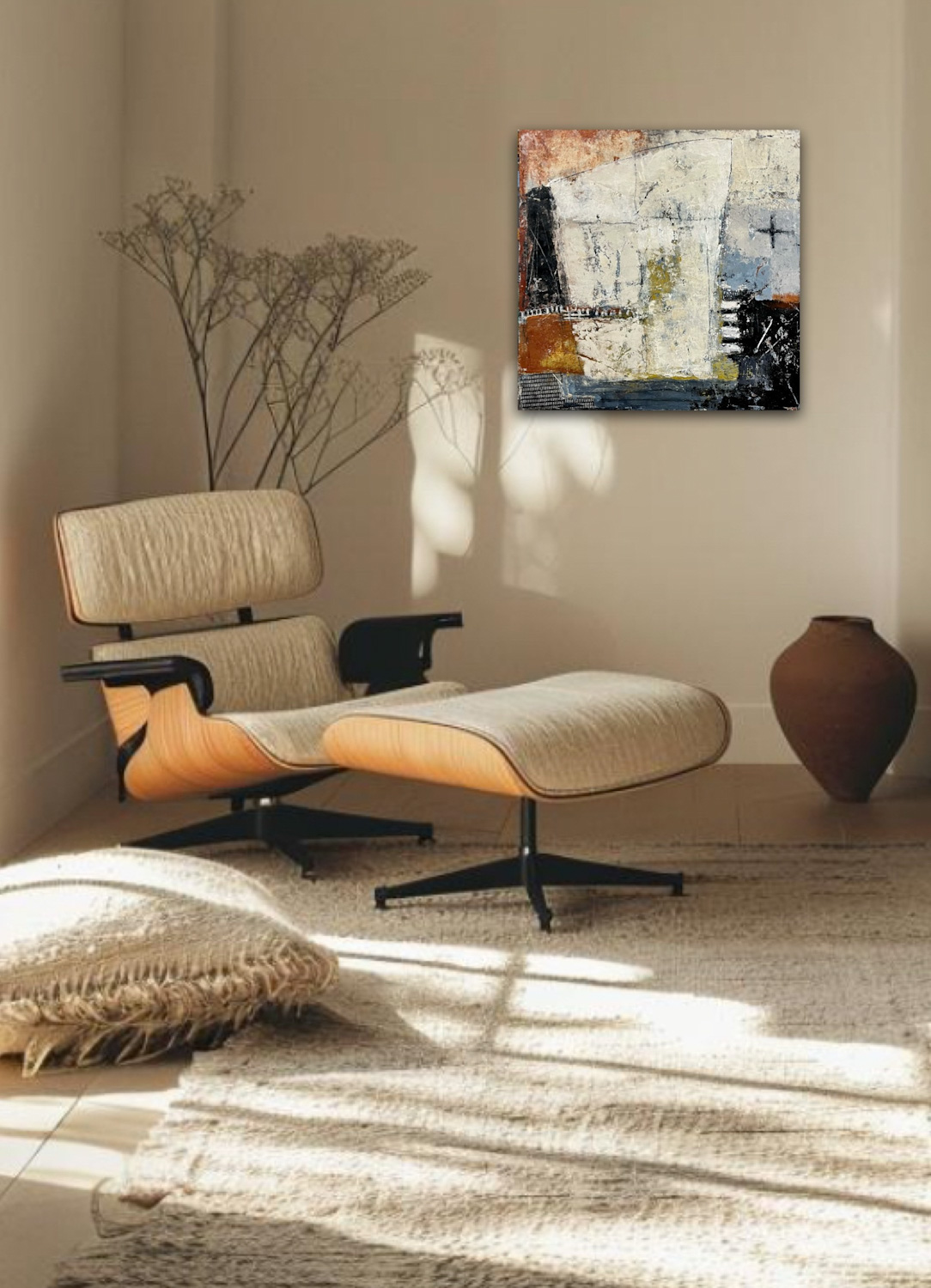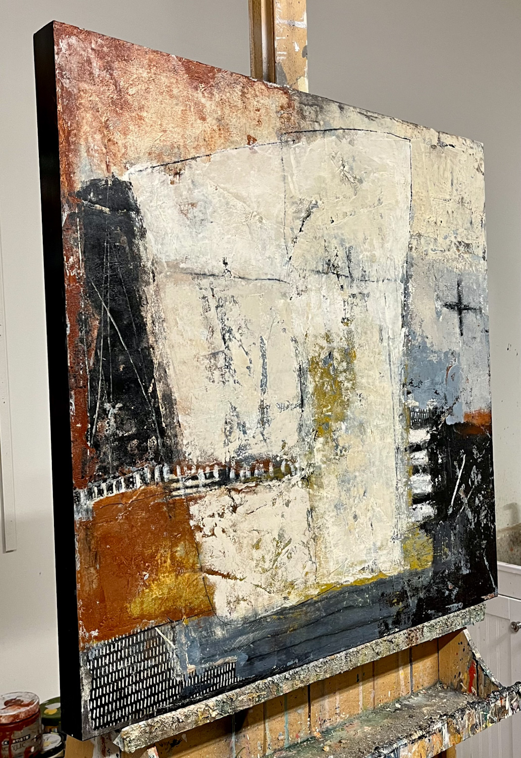 Mixed media acrylic and collage on cradled wood panel 24 x 24 x 1.5 inches.