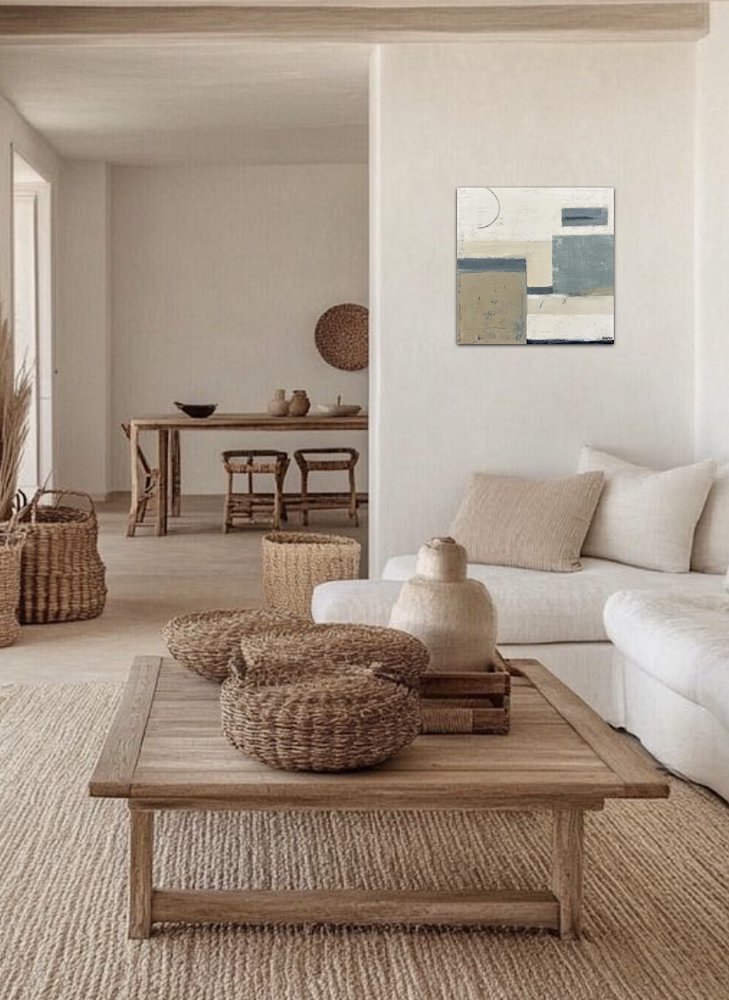A warm mineral surface grounds the composition, while cool blues and soft neutrals open into air above. Subtle marks and layered textures suggest weathering and time–a landscape shaped by light, earth, and the architecture of the desert.