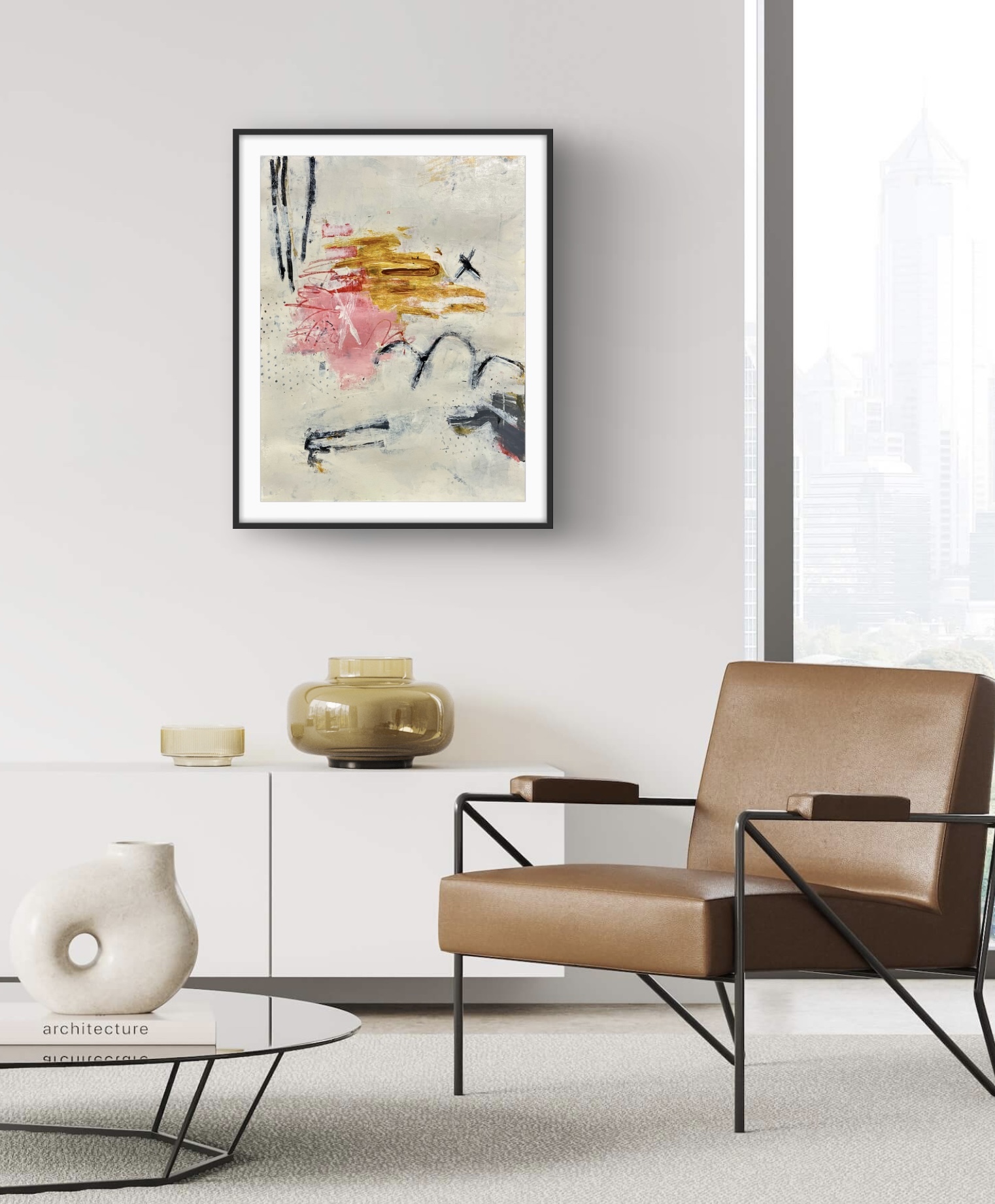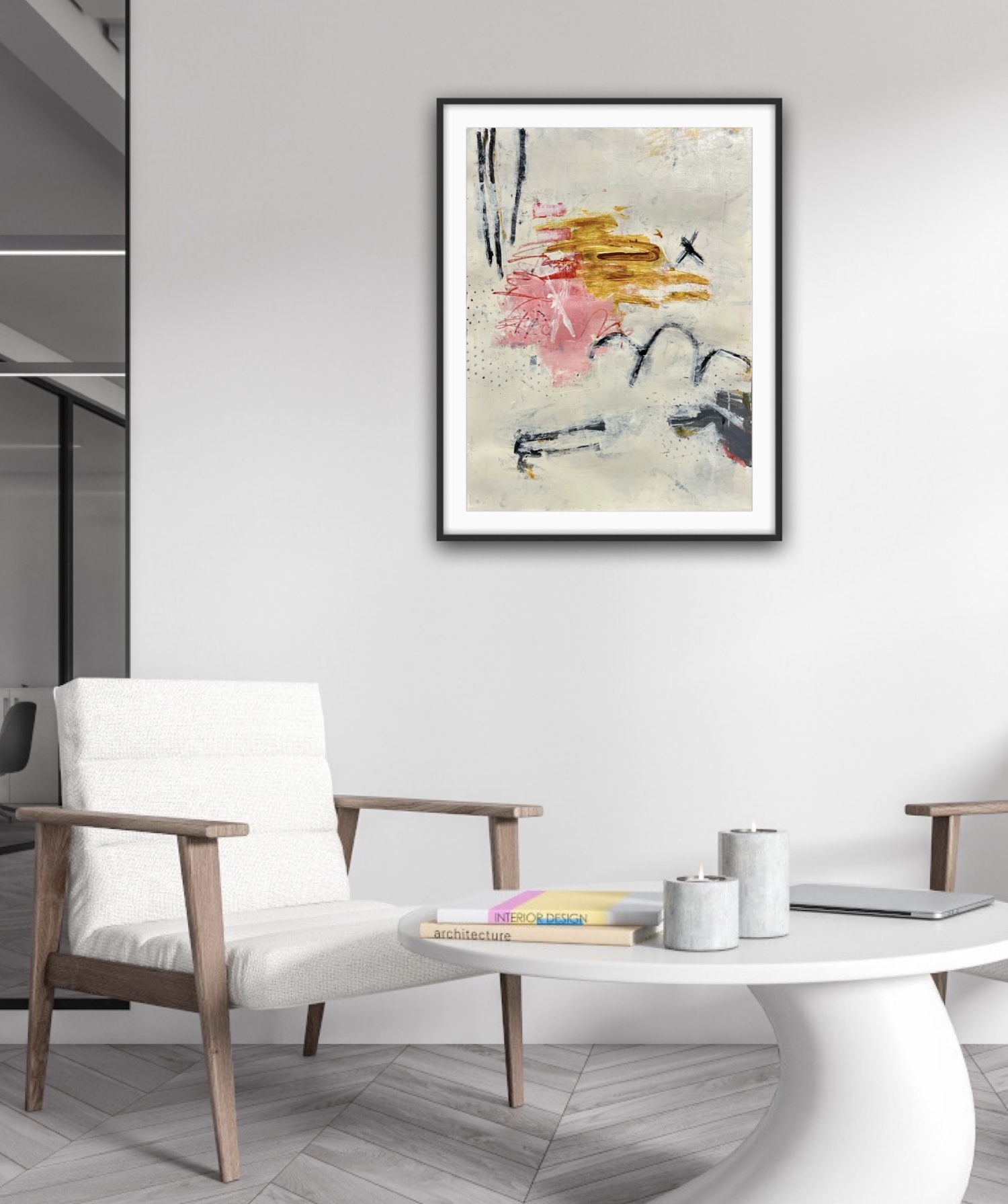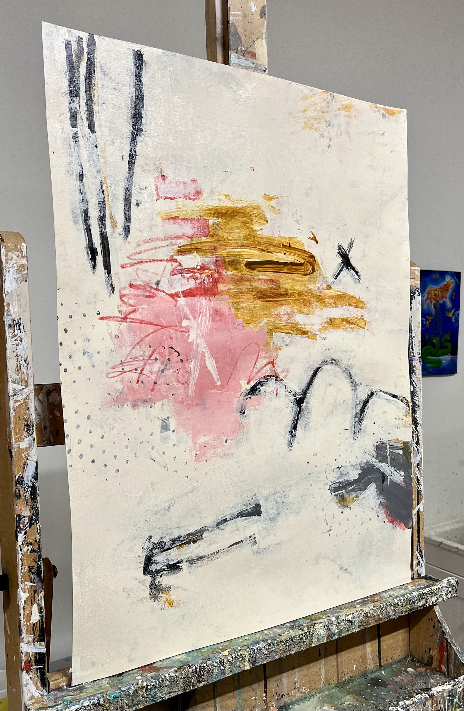 Pink and gold mix with playful, expressive marks in this minimalist abstract.